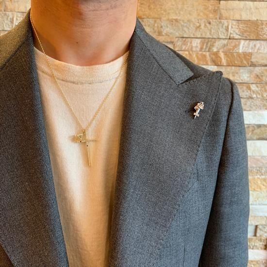 ブートニエールに生花を飾った、古の紳士たちの粋を現代に昇華させた花束モチーフのラペルピン。